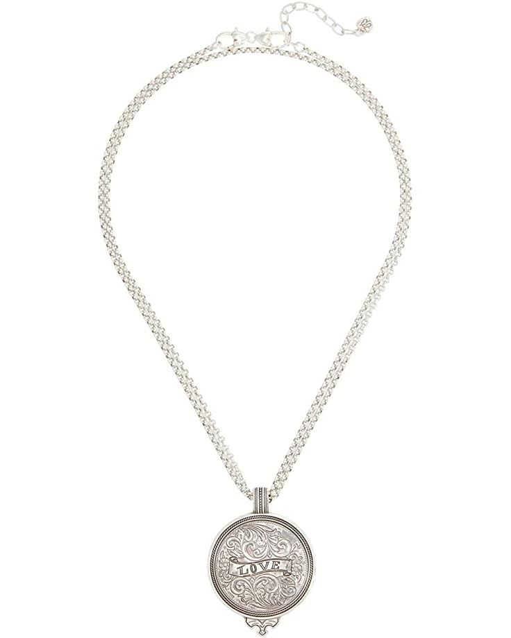- The Brighton® Essex Convertible Necklace is crafted in a silver-tone plated metal with a round pendant engraved with scrolling floral with “Love” at the center on one side and “Forever yours” on the reverse site.