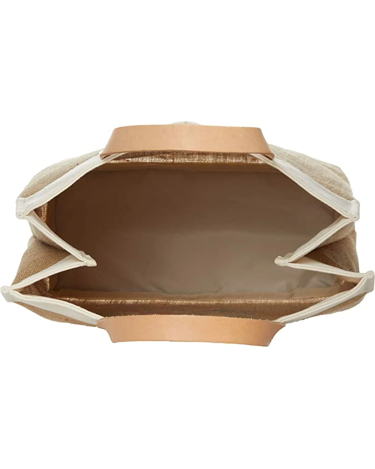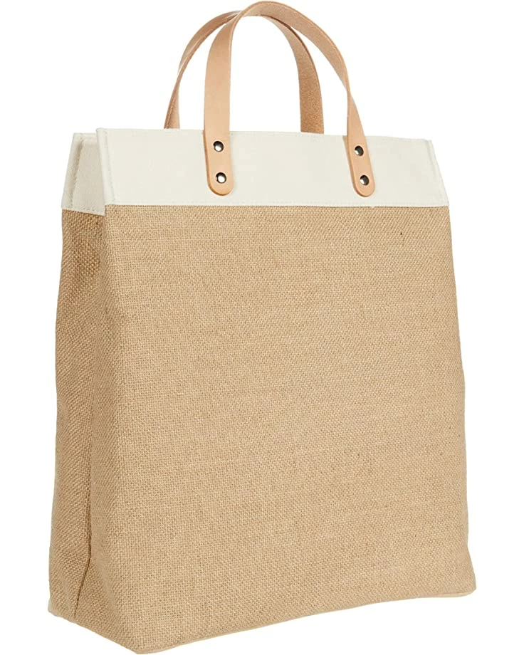 - Playful planet-friendly, reusable tote with dual leather handles.