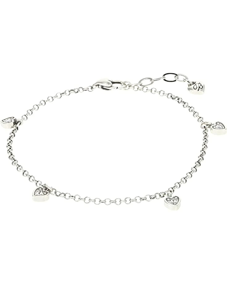 - Silver-tone plated anklet with heart charms and crystal center accent.