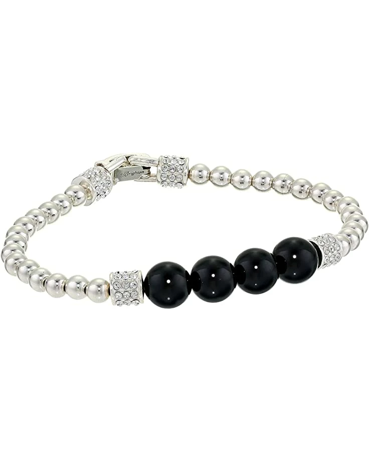 - This silver bracelet pairs the stunning Swarovski-encrusted barrels with natural black Agate beads for an upscale look.