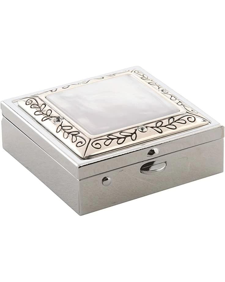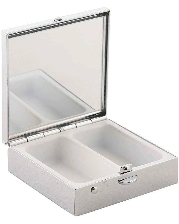 - Features an interior mirror and two pill compartments.